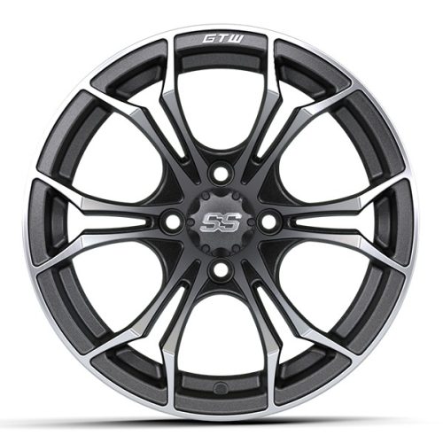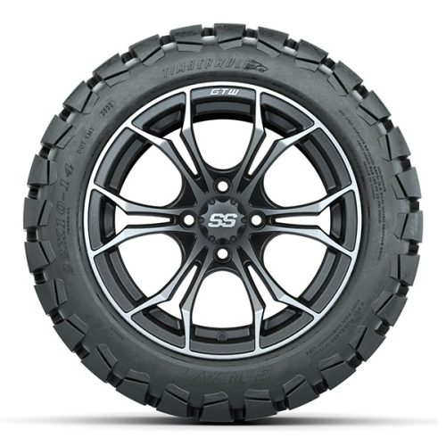 14″ Spyder Matte Gray and Machined Aluminum Golf Cart Wheels and 22″ Tall GTW Timberwolf Tires Combo – Set of 4 – Includes Lug Nuts