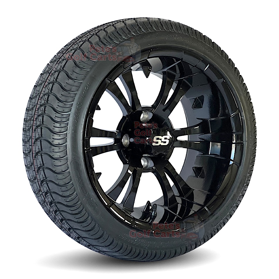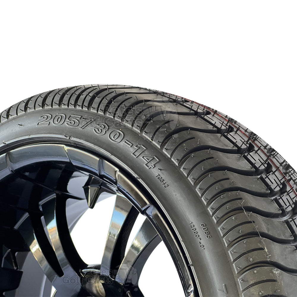 14″ Vampire Gloss Black Golf Cart Wheels and 205/30-14 DOT Low Profile Street Turf Tires for non-lifted golf carts