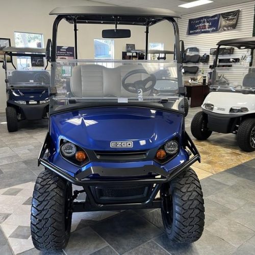 2023 E-Z-Go Express™ S4 ELiTE™ Lithium Electric Blue Live your life to the fullest in the E-Z-GO® Express™ S4. The maintenance-free ELiTE lithiumbattery pack is now customizable to your needs with the all-new 2.2 single, 4.2 twin, or 6.2 triple battery packs, furthering range and dependability. Live out the elevated experience of the Express S4 with an improved front suspension on ELiTE vehicles, for enhanced drivability and maneuverability. Continue to stand out from the crowd with your Express S4. AVAILABLE POWERTRAINS Explore our industry-leading powertrains – each with unique advantages to enhance your life. ELiTE Lithium Powertrain Powered by Samsung SDI Lithium Technology. Maintenance-free batteries with an unbeatable 8-year warranty. Standard Gas Powerful and reliable 13.5 hp Kawasaki gas engine Features may include: STANDARD LED HEADLIGHTS Golf cart headlights and taillights for greater visibility and safety. NEW TIRE AND WHEEL OPTIONS Premium tires and wheels improve ride quality and give another level of customization to your 4 passenger golf cart. PREMIUM INTERIOR WITH UPGRADED STEERING WHEEL AND DASH Enjoy a new level of customization with more dashboard storage. REAR SEAT WITH ENCLOSED STORAGE Comfortable ride for 4 passengers with a rear-facing golf cart seat featuring convenient enclosed storage for all of your adventures. SPECIFICATIONS ConditionNew Year2023 MakeE-Z-GO ModelExpress™ S4 ELiTE™ Lithium Electric Blue Vehicle TypeGolf Cart Category4 Passenger – Lithium MANUFACTURER INFO Motor Power System Type72 Volt AC Motor Power11.7 hp (8.7 kW) Peak Motor ControllerSpeed: 235 Amp AC Performance Top SpeedLevel Ground: 19 mph (31 kph) max Electric Electrical56 Volt Battery BatterySingle, 56 V Li-Ion (Standard Configuration) Battery Charger Type56VDC, 120/230 VAC, UL/CSA, CE Drivetrain DrivetrainMotor Shaft Direct Drive TransmissionDifferential with Helical Gears GearsSelection: Dash Mounted Forward-Neutral-Reverse Axle Capacity, RearRatio: 17:1 (Forward) SteeringSelf-Compensating Rack and Pinion StarterPedal Chassis ChassisBody & Finish: Injection Molded TPO Frame TypeWelded steel with E-coat & DuraShield powder coat Suspension Front SuspensionLeaf Springs with Hydraulic Shock Absorbers Rear SuspensionLeaf Springs with Hydraulic Shock Absorbers Brakes Brake System TypeService: Rear Wheel Mechanical Self-Adjusting Drum Parking BrakeSelf-Compensating, Single Point Engagement Wheels & Tires Front WheelTrack: 37.9 in (96.3 cm) Rear WheelTrack: 39.2 in (99.6 cm) Front TireMT Paramount, 23×10-14, Radial, SPDR Alloy Wheels Rear TireMT Paramount, 23×10-14, Radial, SPDR Alloy Wheels Dimensions DimensionsOutside Clearence Circle: 22.8 ft (7.0m) Overall Length115 in (292 cm) Overall Width49.5 in (124 cm) Overall HeightW/o roof: 52 in (132 cm) | w/ roof: 82 in (208 cm) Wheelbase67.5 in (171 cm) Ground Clearance@ Differential: 7.3 in (18.5 cm) Turning Radius11.0 ft (3.4 m) Capacities Seating Capacity4-Passenger Cargo Capacity800 lb (363 kg) Weights Dry Weight918 lb (428 kg) (without batteries) Curb Weight965 lb (462 kg) Color ColorsElectric Blue Color OptionAvailable Seat: Black, Grey on Black, White on Beige | Premium Seat: Black, Mushroom, Grey