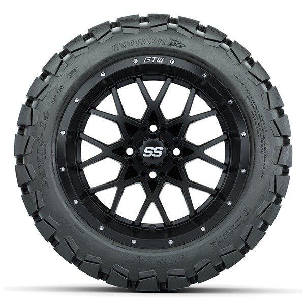 Vortex Matte Black Golf Cart 14″ Wheels and 22×10-14 GTW Timberwolf Tires – Set of 4
